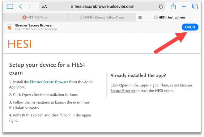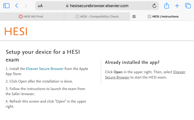 On Demand Training • | iPads Elsevier Secure Browser Faculty Guide: Student Testing on iPads This faculty readiness guide outlines the key steps and information faculty need to know about their test-takers accessing the Elsevier Secure Browser with iPads. Download the Secure Browser App To ensure testing devices are sufficiently prepared for your students’ HESI exams, the Elsevier Secure Browser must be installed and the compatibility check must be run successfully on the appropriate testing devices. Faculty who are proctoring their students’ HESI exams will not need to download the secure browser on the devices they will use to proctor exams. The secure browser only needs to be installed on the devices used for test-taking. Note: Review the device requirements ahead of test day. 1. Use Safari to access HESI NG and click the “Compatibility Check” link in the left menu of the course homepage to download the secure browser and verify system compatibility before the exam. This is the official access point and must be used for both the compatibility check and mock exam. Note: If you get an error using this link, clear the cache on your device or paste into an incognito browser. 2. Open the Compatibility Check and it will prompt the user to download the Elsevier Secure Browser app from the App Store. 3. Once the app is downloaded, click Open and the landing page will be displayed. 4. You can close the landing page to return to the instructions page in HESI NG. 5. Refresh the page. Then, hit “Open,” which will open the Compatibility Check. 6. On exam day, students log into HESI NG and launch their exam. If the app is already downloaded, it will open automatically. If not, students will be prompted to download it and follow the steps above. Note: If the app is opened directly from the iPad home, it will open to the landing page. The app must be accessed via the HESI NG Compatibility Check or exam launch to display content. For student instructions about installing the Elsevier Secure Browser on iPads, share the Elsevier Secure Browser Student Readiness Guide with students. More like this: On Demand Training Elsevier Secure Browser | Personal Devices | Institution-Owned Devices | ESB Chromebooks | iPads Elsevier Secure Browser Faculty Guide: Orientation Video On Demand Training Elsevier Secure Browser | Institution-Owned Devices Elsevier Secure Browser Faculty Guide: Student Testing on Lab or Institution-Owned Devices On Demand Training Elsevier Secure Browser | ESB Chromebooks Elsevier Secure Browser Faculty Guide: Student Testing on Chromebooks On Demand Training Elsevier Secure Browser | Personal Devices Elsevier Secure Browser Faculty Guide: Student Testing on Mac or Windows Devices Need technical or product support? Visit our Evolve Support Center ↗